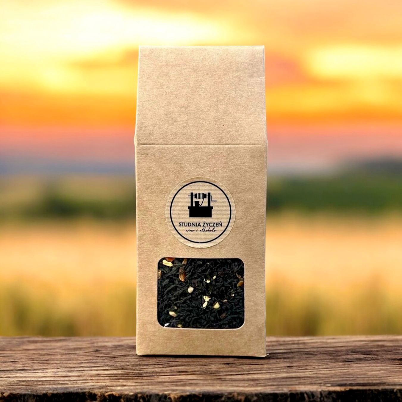 Herbata Czarna ”Alpejski Poncz” to czarna Indyjska herbata Nilgiri z dodatkami rodzynek, kawałków jabłka, cynamonu, kwiatów pomarańczy, liści orzecha włoskiego oraz goździków.